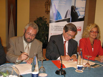 Damián Arroyo, presidente de AEGVE, y Marino Faccini, director general de CWT España, durante la firma pública del acuerdo. A la derecha, Marian Caturla, gerente de AEGVE.
