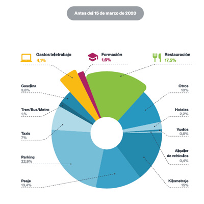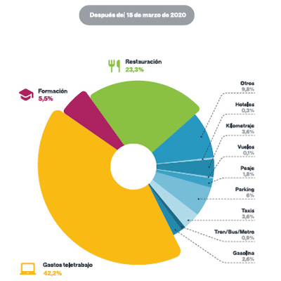 Por un lado, la proporción de gastos de formación se ha multiplicado por cuatro, concretamente del 1,63 % antes del confinamiento al 5,47 % durante este. Aunque ha bajado la formación presencial, aumentan significativamente, como es lógico, las sesiones online. En cuanto a la restauración, a pesar de que el número absoluto de gastos ha descendido considerablemente, la proporción sobre el total sube con fuerza, debido al recurso generalizado a la comida a domicilio.