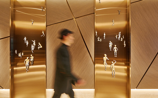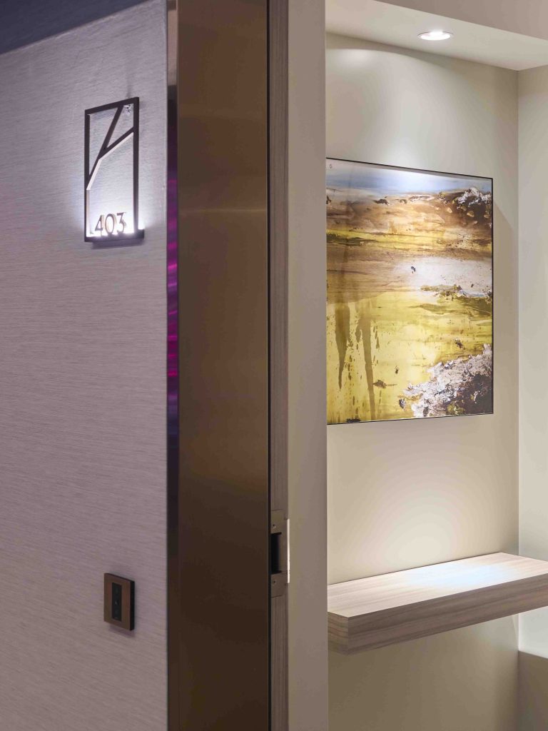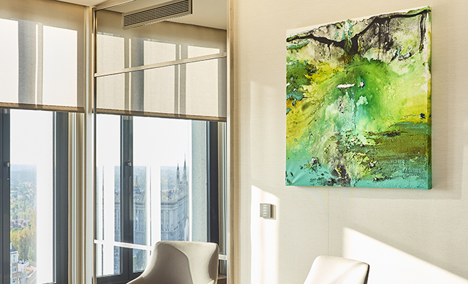 De entre sus numerosas obras, que se extienden por todo el edificio, desde las zonas comunes a las suites, techos y biombos acristalados, sin duda el ejemplo más ilustrativo es “The Waterfall”, del artista Pere Gifre, situada en el atrio. Una inmensa escultura de agua que captura la fuerza, el movimiento y la gravedad de este elemento a niveles físicos y moleculares.