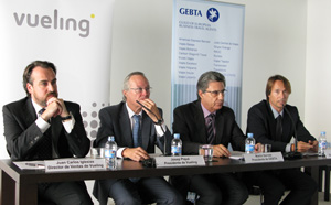 De izda. a dcha., Juan Carlos Iglesias, jefe de Ventas de Vueling; Josep Piqué, presidente de la misma compañía; Martín Sarrate y Marcel Forns, presidente y director gerente de Gebta España, respectivamente.