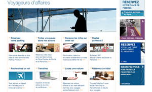 La web de Aéroports de Paris, la sociedad gestora de los tres aeropuertos parisinos (Charles de Gaulle, Orly y Le Bourget) se está convirtiendo en una referencia para los viajeros de negocios. Hasta ahora era posible reservar una plaza de aparcamiento o un hotel. Ahora el pasajero también puede registrarse para un control de fronteras mas rápido o calcular la distancia entre una dirección en la ciudad y la terminal de salida del vuelo. También, comprar por anticipado una conexión a internet sin cable o reservar en un salón VIP.