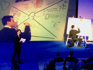 El evento concluyó con una actividad con las agencias de viaje, liderada por Fernando de Pablo, dibujante y experto en visual thinking. A partir de las respuestas de los participantes a distintas preguntas, el dibujante confeccionó un “mapa empático” de las agencias de viaje, en el que quedaron reflejados los retos y el entorno en que se mueve el sector.