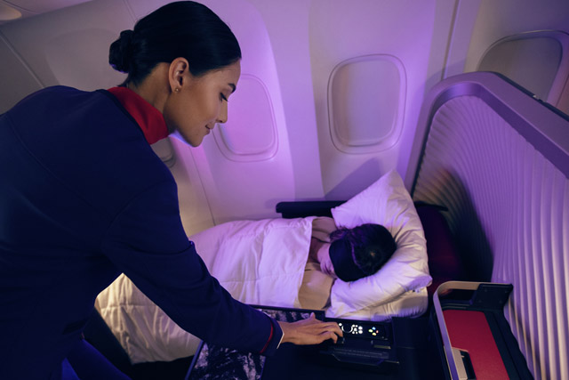 En la nueva cabina Premium Business, cada asiento Thompson ofrece más privacidad y acceso directo al pasillo, así como configuraciones tanto para personas que viajan solas como para parejas. Los asientos se reclinan 180° en una cama full-flat, cuentan con entretenimiento a bordo de última generación con una pantalla de 18″ y tienen un amplio espacio para artículos personales.