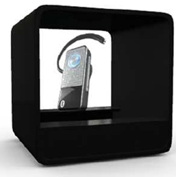 El cubo holográfico permite mostrar todo tipo de productoscomo si el objeto estuviera flotando en el aire.