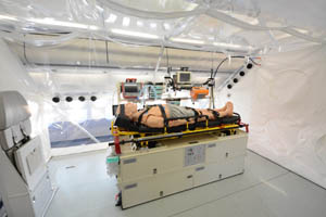 En el interior, los médicos pueden proporcionar a los pacientes tratamientos y cuidados intensivos durante todo el vuelo, sin dejar de estar totalmente protegidos. Dos carpas exteriores, que también son herméticas, sirven como amortiguadores para que se pueda salir y entrar de forma segura.