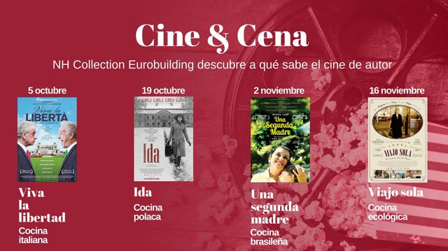 En los próximos dos meses, NH Collection Eurobuilding ofrecerá la posibilidad de disfrutar de sesiones de cine (en versión original subtitulada en español) amenizadas con cenas inspiradas en las proyecciones, elaboradas por el chef Luis Bartolomé, para disfrutar de lo mejor del cine y de la gastronomía.