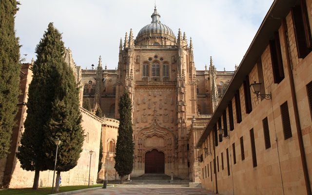 En cada plaza y tras cada esquina, el viajero se siente observado, acompañado en su caminar. La presencia de personajes reales, o no tan reales, como Colón, Lope de Vega, Unamuno, Torrente Ballester, el Lazarillo de Tormes o la Celestina se percibe a cada paso, y más aún cuando se camina por los alrededores de sus dos catedrales o se asciende a la altura de sus torres, convertidas en privilegiados miradores. Iniciativas como Ieronimus, en la Catedral, o Scala Coeli en la Clerecía, consiguen asombrar aún más al visitante. Porque Salamanca tiene dos catedrales hermanas, casi unidas: la Vieja, románica y hermosa, construida entre los siglos XII y XIV, y la Nueva, gótica y espectacular, del XVI al XVIII.
