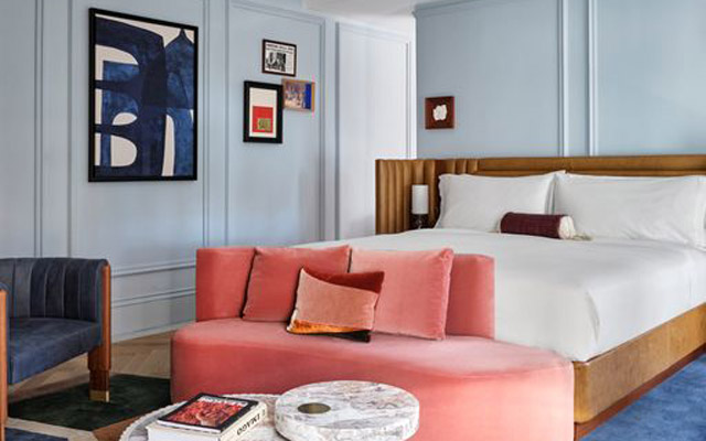 Las habitaciones cuentan con grandes ventanales de suelo a techo, envueltos en cortinas de terciopelo rojo vino y suelos de madera con patrón de espiga que se funden con modernos baños de mármol.